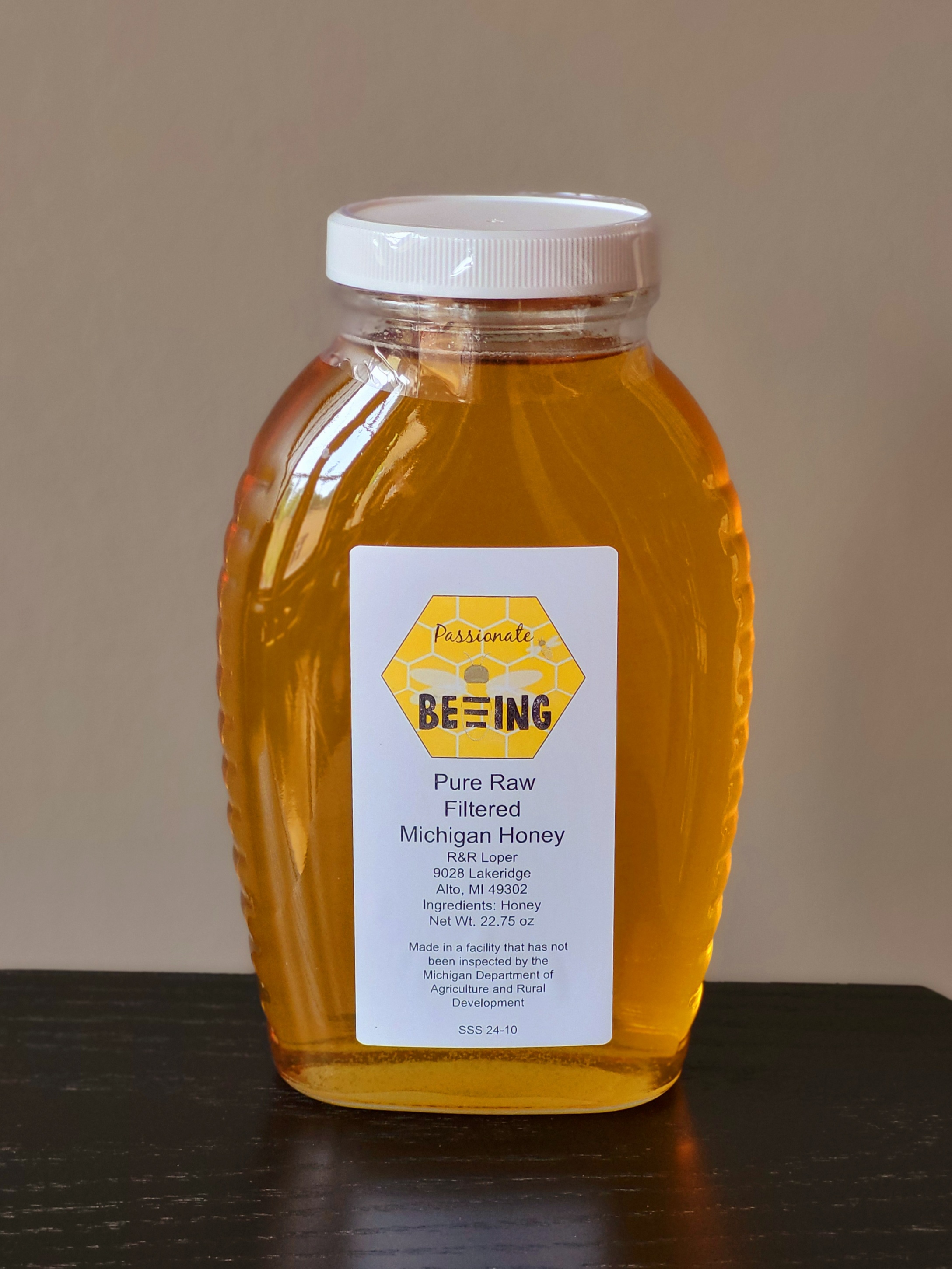 A new venture for Grand Rapids Coffee Roasters - bee keeping with Passionate Beeing. Our friends, Rita & Randy have been keeping bees since 2018 and asked if we would be interested in learning more about beekeeping. We said of course and helped them harvest this year's honey on their property in August. For more information, see below written by Randy: Passionate Beeing was started by helping friends harvest honey for two years and hundreds of hours of research into why we should start a bee apiary. In 2018, we decided to give bees a try but within certain guidelines. One, stay small, it would be the only way we could keep our bees wholesome and healthy. Two, research, research, research. We started attending Michigan Beekeeper meetings and learning from experts at MSU. In addition, we partnered with a mentor with over 60 years of beekeeping experience. Third, utilize help wherever possible and share our knowledge with others. The outcome of these guidelines was an environmentally friendly and happy apiary that produced all-natural wildflower honey. Our honey is not processed in any way other than filtering out unwanted material such as beeswax. We also build all out our own hive equipment using recycled products. Our bees forage on acres of wetlands behind our house and around Blodgett lake.